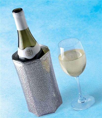 Ταχυπαγοκύστη φιάλης κρασιού σε ασημί χρώμα.Διατηρούμε μόνιμα την ταχυπαγοκύστη στην κατάψυξη και όταν την χρειαστούμε την τοποθετούμε σαν "γάντι" γύρο από την φιάλη.Εάν η φιάλη είναι ζεστή τότε της κατεβάζει την θερμοκρασία γρήγορα ενώ εάν η φιάλη είναι ήδη κρύα τότε την διατηρεί σε χαμηλή θερμοκρασία για περισσότερη ώρα.